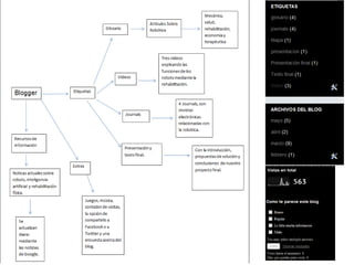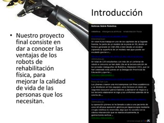 El documento habla sobre los robots de rehabilitación física. Explica que el proyecto consiste en dar a conocer las ventajas de estos robots para mejorar la calidad de vida de las personas que los necesitan. Se creó un blog para informar sobre las funciones y beneficios de los robots de rehabilitación en terapias físicas, con el objetivo de que empresarios inviertan en ellos para mejorar la salud de personas con discapacidades a través de fisioterapias asistidas por robots.