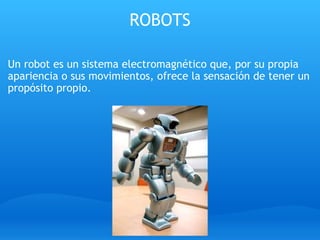 Este documento describe los robots exploradores y sus usos. Los robots exploradores se utilizan para explorar lugares peligrosos o de difícil acceso para los humanos, como en el fondo del océano o en otros planetas. Pueden transmitir imágenes y recopilar muestras y objetos. Algunos ejemplos son las sondas que han explorado Marte, como Pathfinder, Spirit y Opportunity, que analizaron el terreno en busca de agua y tomaron muestras del suelo. Un reto actual es dotar a los robots exploradores de