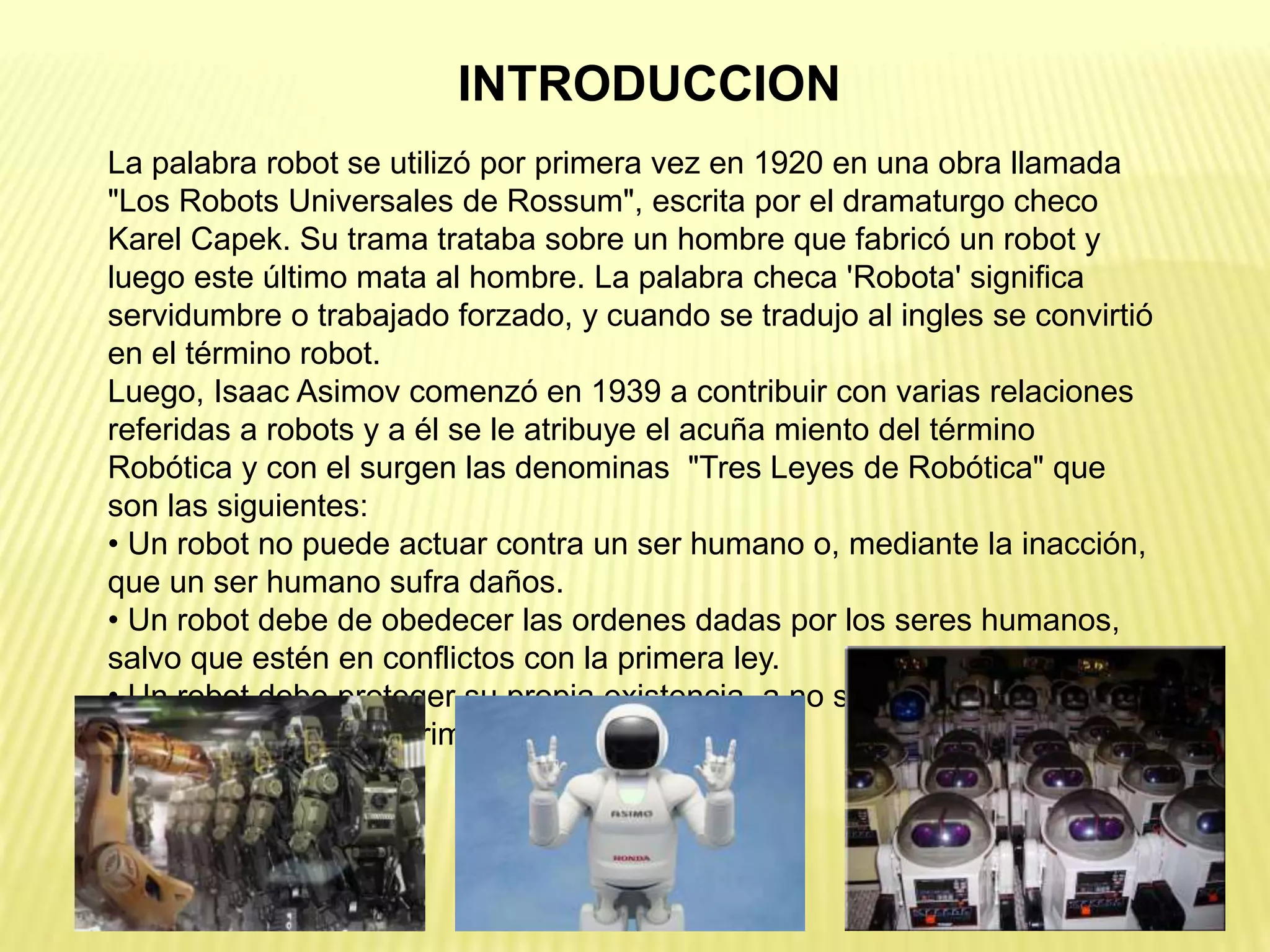La palabra robot se utilizó por primera vez en 1920. Desde entonces, los robots han evolucionado de muñecos mecánicos a máquinas industriales programables. Los robots modernos tienen diversas aplicaciones como la soldadura, pintura y montaje en fábricas. Existen diferentes tipos de robots como los industriales, móviles, médicos y androides.