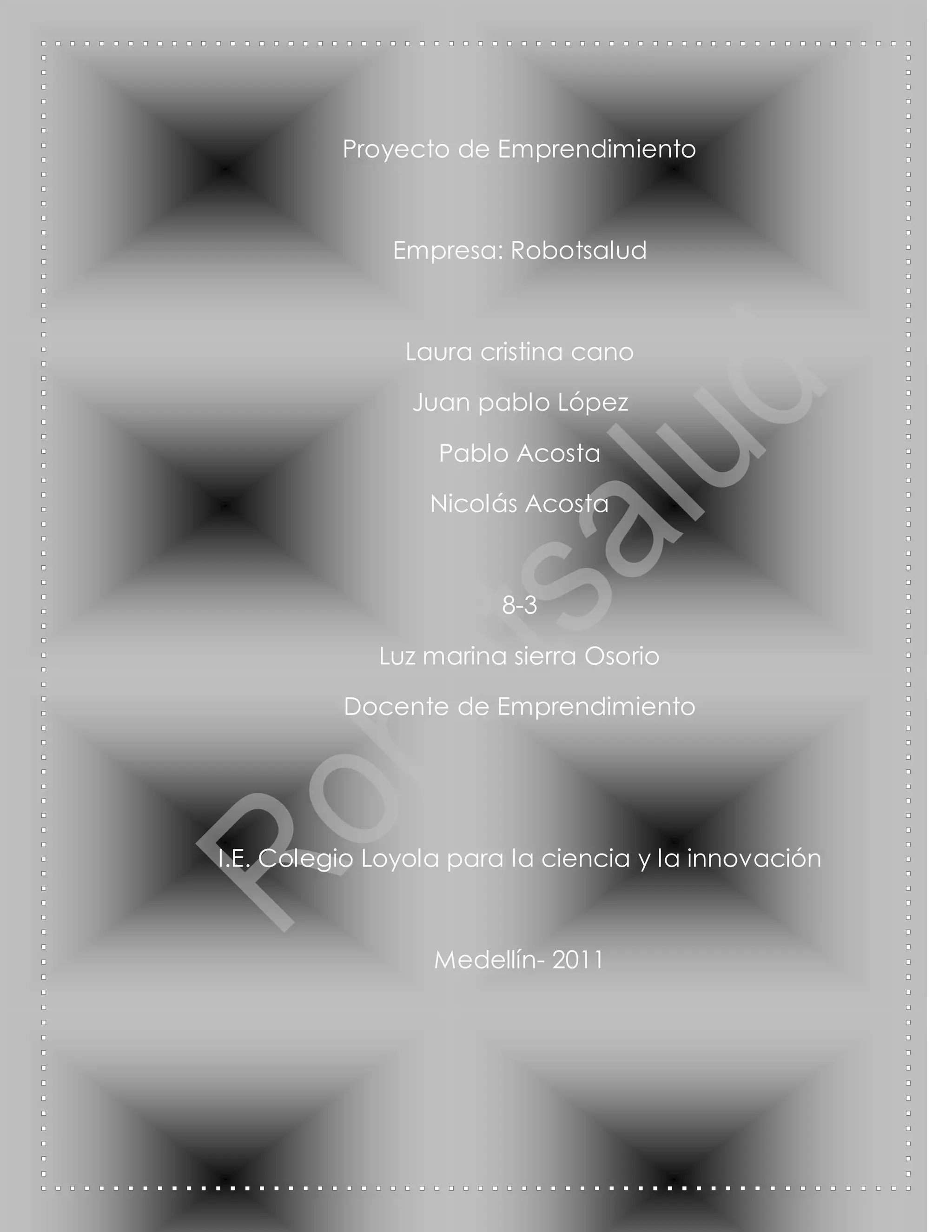 El documento presenta el proyecto de una empresa llamada Robotsalud que busca desarrollar tecnología médica avanzada como el Pastichip (una pastilla con microchip para identificar cáncer), el Neurolobot (para detectar tumores cerebrales), el DEXBOT (para analizar enfermedades respiratorias) y el Robot sangre (para analizar compatibilidad sanguínea y problemas circulatorios). El objetivo general es crear nuevas curas contra enfermedades mediante robots y software. El equipo cree que estos dispositivos médicos te