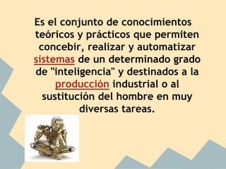 Este documento presenta una clasificación de los robots según su cronología y arquitectura. Según su cronología, existen cuatro generaciones de robots: la primera generación son manipuladores mecánicos, la segunda pueden repetir movimientos aprendidos, la tercera tienen control sensorizado, y la cuarta son robots inteligentes. Según su arquitectura, los robots pueden ser poliarticulados, móviles, androides, zoomórficos o híbridos. El documento concluye que el objetivo actual de la robótica es lograr