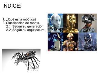 La robótica es la ciencia y tecnología de los robots. Combina disciplinas como mecánica, electrónica, informática e inteligencia artificial. Los robots se clasifican por generación, como manipuladores de 1a generación y robots inteligentes de 4a generación, o por arquitectura, como poliarticulados, móviles, androides, zoomórficos y híbridos.