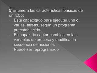 Este documento trata sobre los sistemas automáticos y robots. Define que los robots son sistemas de lazo cerrado capaces de captar información y modificar sus acciones según un plan programado. Considera que objetos como lavadoras y neveras pueden clasificarse como robots debido a que cumplen funciones de forma automática siguiendo programas. Explica también los componentes básicos de un robot y las diferentes categorías o generaciones de robots industriales.