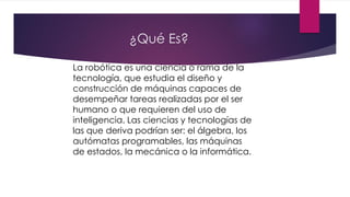 La robótica es una ciencia que estudia el diseño y construcción de máquinas capaces de realizar tareas humanas o que requieren inteligencia. Su historia ha estado ligada a la creación de artefactos para aliviar el trabajo humano. Las tres leyes de la robótica de Isaac Asimov establecen que los robots no pueden dañar humanos, deben obedecer órdenes humanas excepto si van en contra de no dañarlos, y deben protegerse a sí mismos siempre que no entre en conflicto con las otras dos leyes.