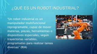 Un robot industrial es un manipulador multifuncional reprogramable que puede mover materiales, piezas u herramientas según trayectorias variables programadas para realizar diversas tareas. Existen diferentes tipos de robots industriales como cartesiano, scara y brazo articulado, los cuales tienen varios grados de libertad y efectores finales para manipular objetos.