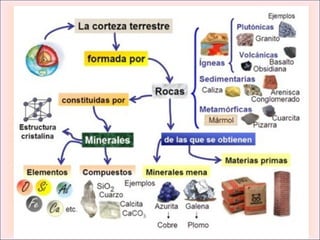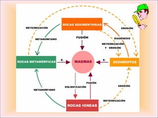 Este documento describe las diferentes clases de rocas, incluyendo rocas ígneas, sedimentarias y metamórficas. Las rocas se forman a partir de la solidificación de magma, la acumulación y cementación de sedimentos, y la transformación de otras rocas debido a la presión y temperatura. Se proporcionan ejemplos como el granito, la arenisca, el mármol y la pizarra para ilustrar cada clase principal de roca.