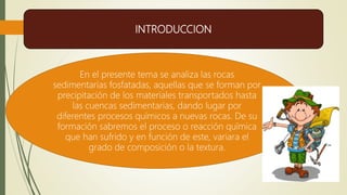 Este documento describe las rocas sedimentarias fosfatadas. Se dividen en dos grupos: las que contienen menas de apatito en rocas ígneas y metamórficas, y las fosforitas sedimentarias como la francolita y colofanita. Las fosforitas pueden ser estratificadas, bioclásticas, nodulares, conglomerádicas o formadas por guano. Se forman principalmente en ambientes marinos como resultado de procesos sedimentarios y diagenéticos.