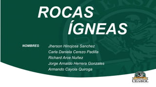 Este documento describe las rocas ígneas o magmáticas. Se originan cuando el magma se enfría y solidifica, ya sea cerca de la superficie o en el interior de la corteza terrestre. Las rocas ígneas se clasifican en plutónicas, volcánicas o filonianas dependiendo de dónde se solidifiquen. Algunos ejemplos comunes son el granito, basalto, diorita y gabro.