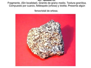 El documento describe diferentes tipos de rocas, incluyendo rocas ígneas plutónicas (granito, diorita, sienita), rocas ígneas volcánicas (basalto, andesita, dacita), rocas sedimentarias (caliza, dolomía, marga), rocas metamórficas (pizarra, esquisto, serpentinita, cuarcita, mármol, gneis) y otras (obsidiana, pumita, yeso, alabastro, brecha). Para cada roca se proporciona una breve
