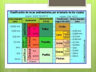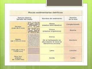 Las rocas sedimentarias se forman por la acumulación y consolidación de sedimentos. Pueden formarse en orillas de ríos, valles, lagos y mares. Presentan una estructura estratificada con capas producidas por el proceso de sedimentación. A menudo contienen fósiles y son permeables. Cubren más del 75% de la superficie terrestre.