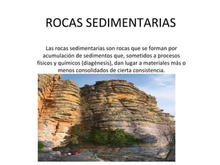 Este documento describe las rocas sedimentarias, incluyendo su formación a través de procesos sedimentarios y diagénesis. Discute los diferentes ambientes sedimentarios continentales y marinos, y clasifica las rocas sedimentarias en tres tipos principales según su origen: mecánico, químico u orgánico.