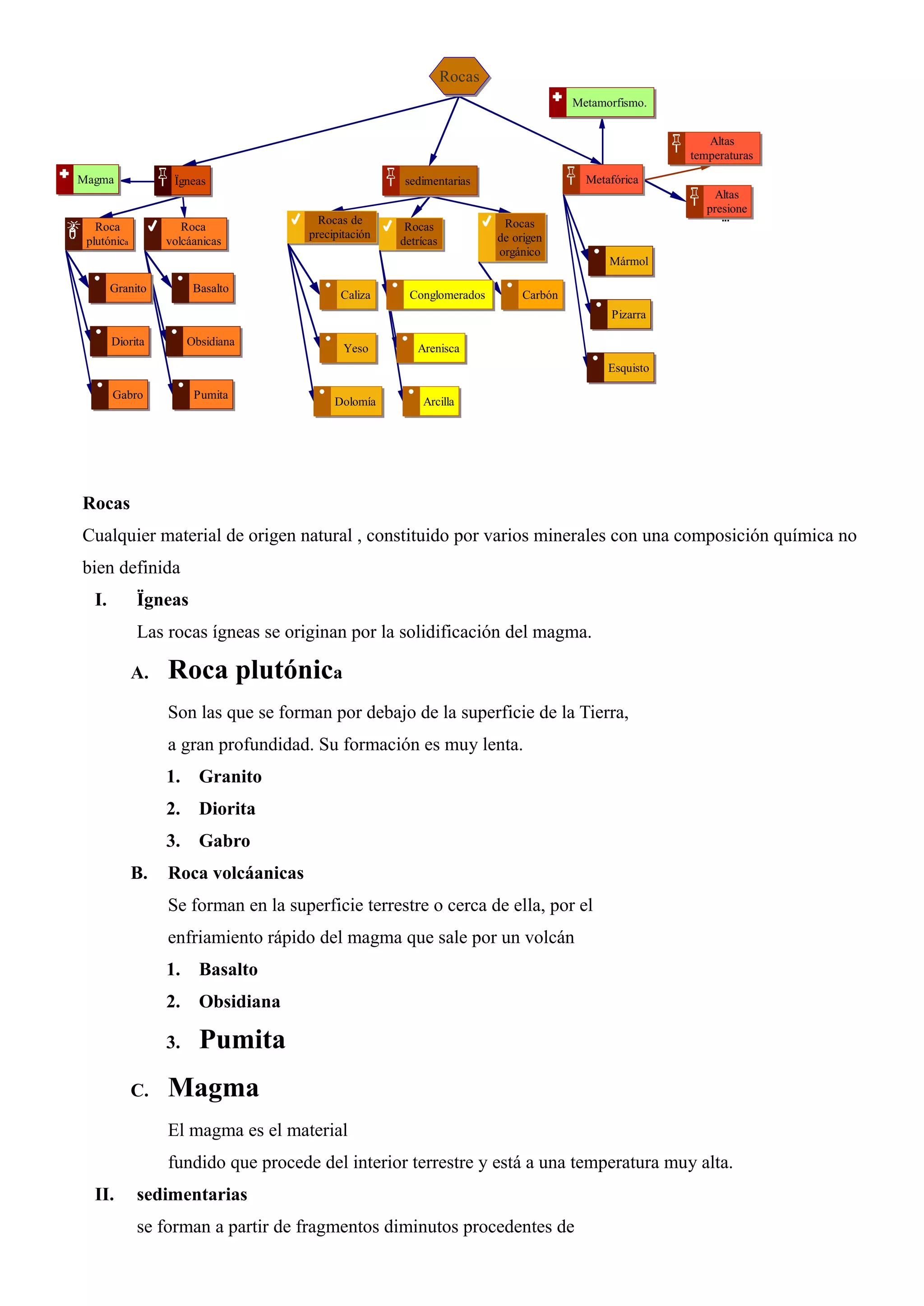 Este documento describe los tres tipos principales de rocas: ígneas, sedimentarias y metamórficas. Las rocas ígneas se forman por la solidificación del magma ya sea debajo de la superficie terrestre como rocas plutónicas o en la superficie como rocas volcánicas. Las rocas sedimentarias se forman a partir de fragmentos transportados por el agua, hielo o viento. Las rocas metamórficas se originan a partir de otras rocas que han sido sometidas a altas temperaturas y