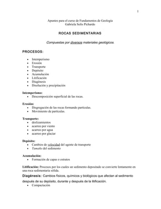 Este documento presenta una introducción a las rocas sedimentarias. Explica que están compuestas por diversos materiales geológicos que se depositan a través de procesos como la erosión, el transporte y la acumulación. Describe los tipos de sedimentos clásticos y no clásticos, así como las rocas sedimentarias de origen detrítico y químico. Finalmente, introduce conceptos como facies sedimentarias, ambientes de depósito y fuentes de energía como el carbón y el petróleo.