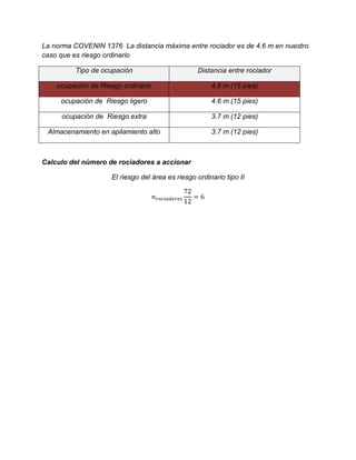 Este documento presenta los cálculos hidráulicos para un sistema de rociadores contra incendios en un área de almacén. Incluye la determinación del caudal, diámetros de tubería, velocidades, pérdidas de carga y presiones para tres circuitos independientes. El objetivo es verificar que el diseño cumple con la normativa aplicable y proporciona la cobertura necesaria.