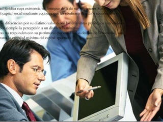 Las sociedades anónimas son entidades jurídicas distintas de sus propietarios cuyos titulares poseen capital social mediante acciones que les otorgan derechos económicos y de voto. Las acciones pueden diferir en valor o privilegios como dividendos mínimos. Los socios no responden con su patrimonio personal por las deudas de la sociedad, sino hasta el capital aportado. La administración está a cargo del directorio y la asamblea de accionistas designa a los directores.