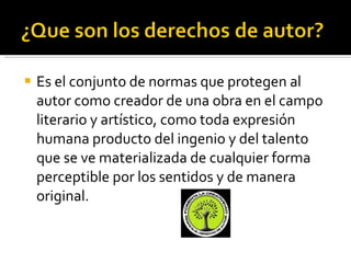 El documento describe los derechos de autor como las normas que protegen al creador de una obra literaria o artística original de su utilización o explotación no autorizada. Estos derechos incluyen los derechos morales perpetuos sobre la obra y los derechos patrimoniales sobre los beneficios económicos derivados de la obra, aunque existen limitaciones y excepciones a estos derechos para garantizar otros derechos como la educación e investigación.
