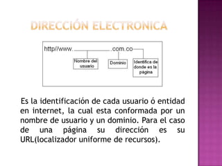 Este documento define varios términos clave relacionados con la identificación y seguridad en internet, incluyendo direcciones IP, MAC, URL, HTTPS y dominios. También describe los registradores de dominios y dos categorías comunes de ataques a dominios: Denegación de servicio y suplantación DNS.