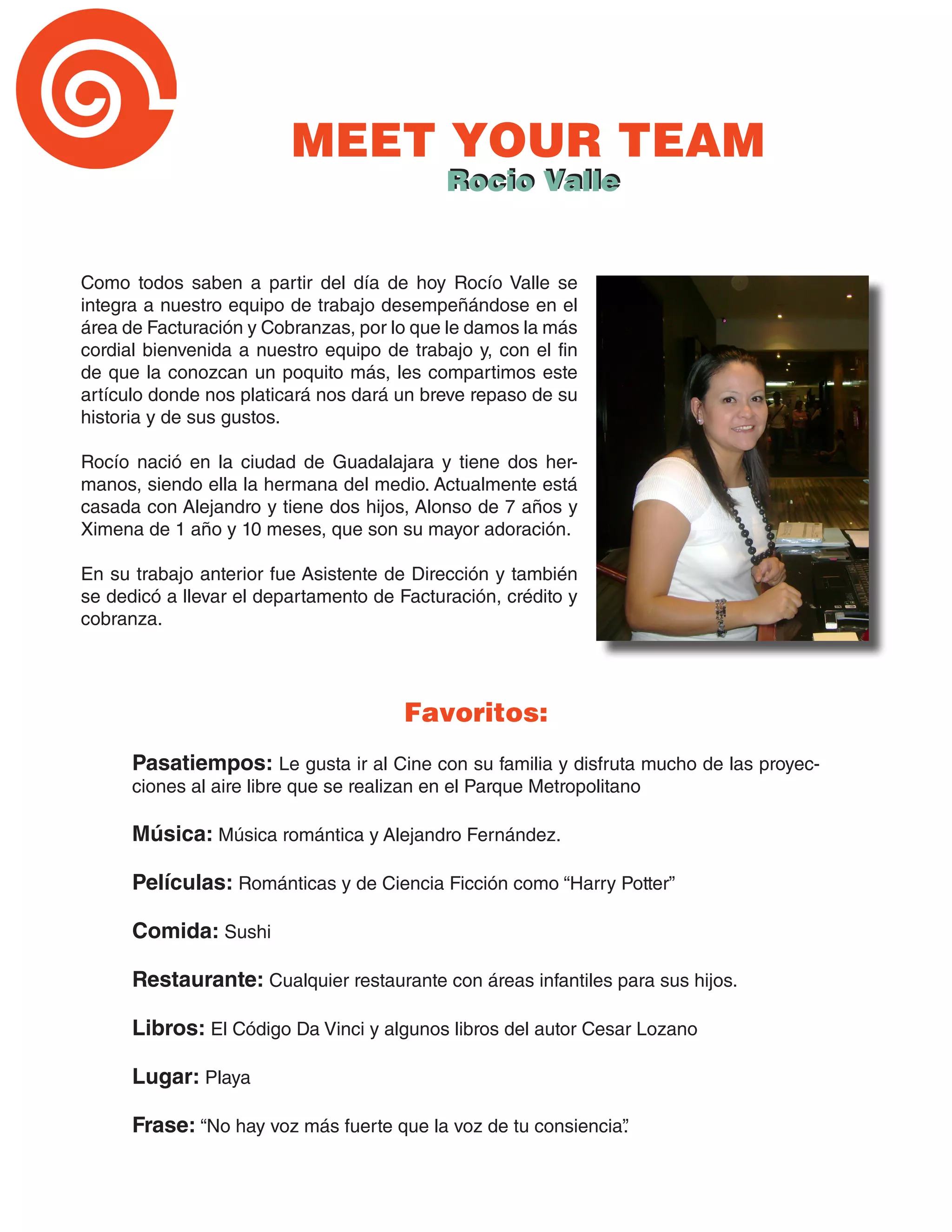 Rocío Valle se ha unido al equipo de trabajo en el área de Facturación y Cobranzas. Nació en Guadalajara y está casada con dos hijos. Anteriormente trabajó como Asistente de Dirección y también se dedicó a la Facturación, crédito y cobranza. Sus pasatiempos favoritos incluyen ir al cine con su familia, música romántica, películas de ciencia ficción como Harry Potter, y comer sushi.