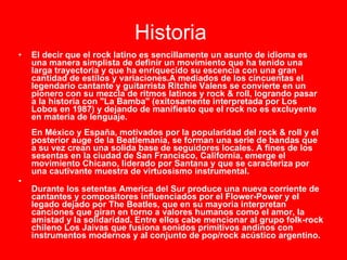 El documento resume la historia del rock latino desde sus inicios en la década de 1950 hasta la actualidad, destacando a importantes exponentes del género como Ritchie Valens, Soda Stereo, Los Prisioneros, Virus, GIT, Enanitos Verdes y Charly García. El rock latino ha evolucionado a lo largo de las décadas fusionando ritmos latinos con el rock and roll e influenciado por movimientos como el flower power y la new wave, con letras que abordan temas sociales y humanos.