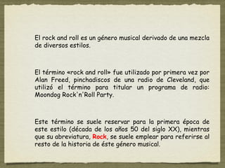 El documento resume la historia del rock and roll y sus principales géneros y estilos musicales desde la década de 1950 hasta la década de 1990. Se describe el origen del término "rock and roll" y cómo evolucionó el género con el tiempo desde sus raíces en el rock and roll de los años 50 hasta los diversos estilos que surgieron en décadas posteriores como el rock psicodélico, el heavy metal, el punk, el new wave, el grunge y más.