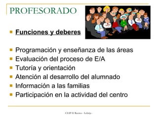 El documento describe las funciones y derechos del profesorado, la autonomía de los centros educativos para elaborar sus planes y programas, los órganos de gobierno de los centros como el Consejo Escolar y el Claustro de Profesorado, y aspectos sobre la organización y horarios del profesorado.