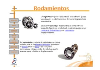 Este documento describe los cojinetes y rodamientos, incluyendo su definición, partes, tipos de carga, y representación gráfica. Un cojinete es una pieza que permite el giro de un eje con poco rozamiento, y puede ser de deslizamiento o de rodadura. Los rodamientos reducen la fricción entre un eje y las piezas conectadas mediante rodadura. Se clasifican según la dirección de la carga aplicada, como axial, radial o mixta.