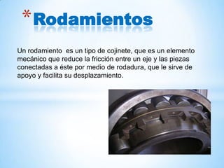 Este documento describe los diferentes tipos de rodamientos, incluyendo rodamientos de bolas, de rodillos cilíndricos, de agujas, cónicos, de empuje y autoalineables. Explica las características y usos típicos de cada tipo de rodamiento.