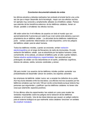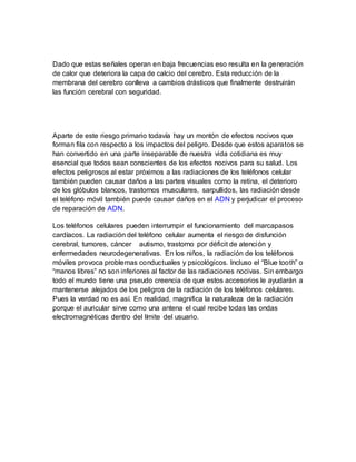 Los teléfonos celulares emiten radiación electromagnética que puede ser absorbida por los tejidos humanos, especialmente la cabeza. Varios estudios han encontrado vínculos entre el uso prolongado de teléfonos celulares y problemas de salud como tumores cerebrales, cáncer, dolores de cabeza y problemas cognitivos. Aunque las compañías de telefonía celular niegan los riesgos, experimentos recientes continúan revelando los peligros potenciales de la radiación emitida por los teléfonos para la salud humana.