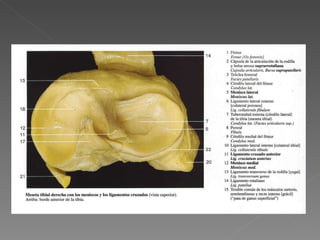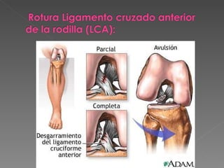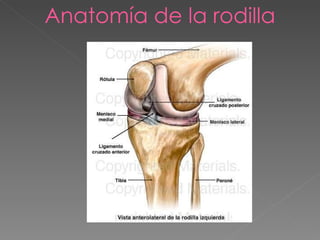 La articulación de la rodilla consta de tres huesos principales (fémur, tibia y rótula) que forman tres articulaciones. La rodilla está protegida por una cápsula articular, meniscos, ligamentos y bolsas serosas. Puede sufrir diferentes lesiones como fracturas, desgarros de ligamentos o meniscos, y enfermedades como artrosis o bursitis, que requieren tratamientos que van desde el reposo hasta la cirugía.