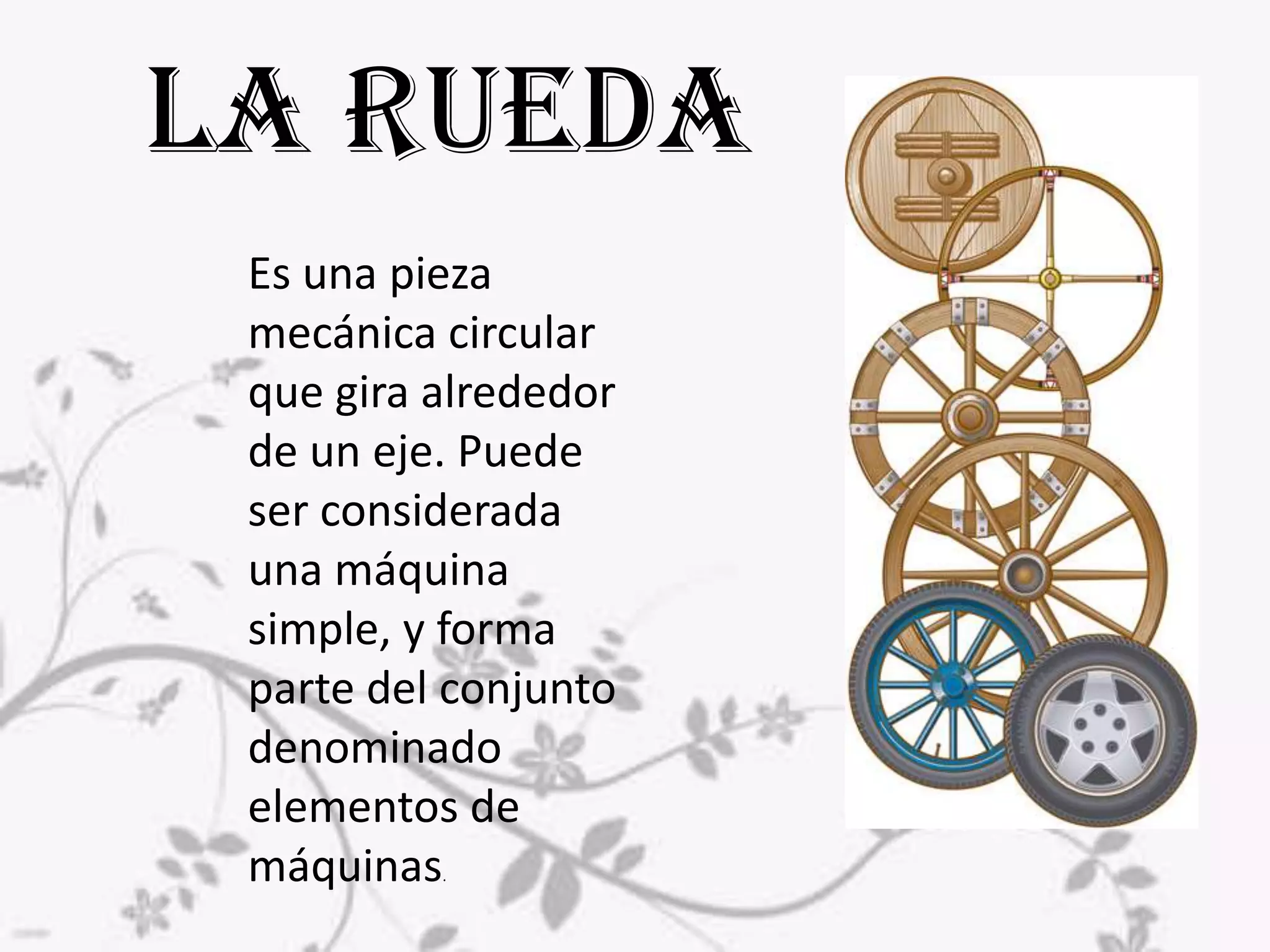 La rueda es una pieza circular que gira alrededor de un eje y se usa para facilitar el movimiento y la transmisión de fuerza. Existen varios tipos como ruedas dentadas, de transporte y poleas que cumplen funciones como transmitir movimiento entre ejes, reducir fricción y esfuerzo. Los rodillos son similares pero permanecen fijos y permiten el desplazamiento de objetos sobre ellos, usándose comúnmente como cojinetes, en cintas transportadoras y para conformar materiales.