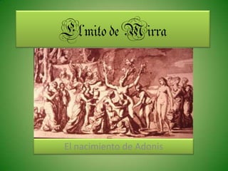 Este documento presenta varias versiones del mito griego de Mirra. En la mayoría de las versiones, Mirra se enamora de su padre, Cíniras, ya sea por una maldición de Afrodita o por su propia voluntad. Con la ayuda de su niñera, logra tener relaciones sexuales con Cíniras disfrazada. Cuando Cíniras descubre la verdad, quiere matarla, pero los dioses la transforman en un árbol de mirra. Adonis nace del árbol de mirra.