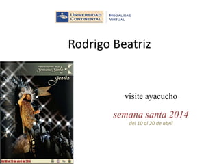 Rodrigo visitó Ayacucho del 10 al 20 de abril durante la Semana Santa de 2014. Visitó la ciudad de Ayacucho del 10 al 20 de abril durante la Semana Santa de 2014.