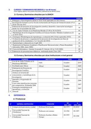 El documento presenta la hoja de vida de Rodrigo Moisés Robalino Chiriboaga, docente de la Universidad Nacional de Chimborazo. Incluye información personal, formación académica (licenciatura, maestría y doctorado), experiencia profesional (como docente, directivo y capacitador), publicaciones e idiomas. Robalino ha trabajado como docente y en cargos directivos en varias instituciones educativas durante más de 30 años.