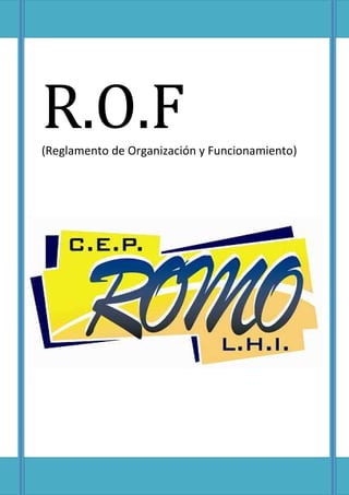 Este documento presenta el Reglamento de Organización y Funcionamiento (R.O.F.) del Centro Educativo Público Romo LHI. Define la estructura organizativa y de gobierno del centro, incluyendo órganos colegiados como el Órgano Máximo de Representación, el Claustro de Profesores y el Equipo Directivo, así como órganos unipersonales como el Director, Jefe de Estudios y Secretario. También establece normas para garantizar la convivencia y participación de la comunidad educativa,