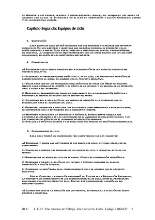 Este documento establece los reglamentos de funcionamiento de varios órganos de coordinación educativa en un centro escolar. Detalla la composición, convocatorias y competencias del Claustro de Profesorado, los equipos docentes, los equipos de ciclo, los equipos de orientación y el equipo técnico de coordinación pedagógica. El objetivo es promover la coordinación entre los maestros y la tutoría del alumnado para mejorar el aprendizaje y la evaluación de acuerdo con el proyecto educativo del centro.