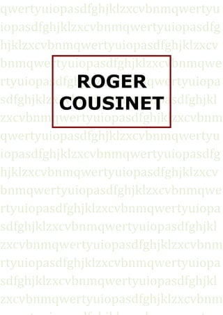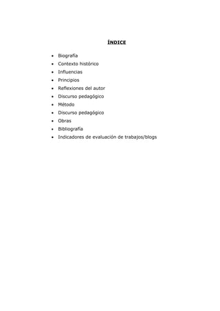 Este documento presenta un índice sobre la vida y obra del pedagogo francés Roger Cousinet. El índice incluye secciones sobre su biografía, el contexto histórico, sus influencias, principios, reflexiones, discurso y método pedagógico, obras y bibliografía.