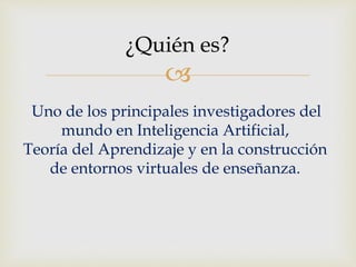 Roger C. Schank es un investigador pionero en inteligencia artificial y teoría del aprendizaje. Aboga por un cambio del sistema educativo tradicional, basado en aulas y profesores, a uno centrado en que los estudiantes aprendan haciendo sobre temas que les interesan, guiados por expertos. Critica que el sistema actual convierte a muchos estudiantes brillantes en adultos infelices y que los políticos y universidades son obstáculos para cambios necesarios.