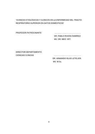Este documento presenta una revisión bibliográfica sobre la enfermedad del tracto respiratorio superior en gatos domésticos. Describe varios agentes etiológicos involucrados como el Herpesvirus-1 Felino, Calicivirus Felino, Bordetella bronchiseptica, Chlamydophila felis y Mycoplasma spp. Explica aspectos epidemiológicos, de transmisión, signos clínicos, diagnóstico y tratamiento de esta enfermedad infecciosa multifactorial que afecta principalmente a cachorros y