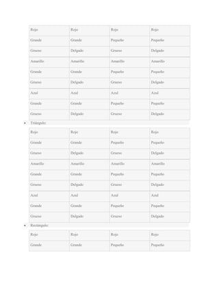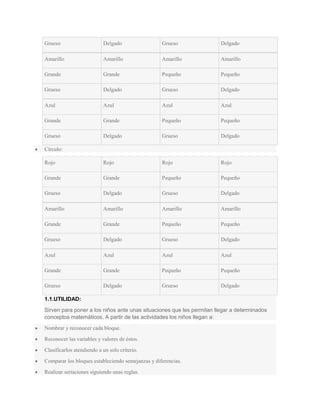 El documento describe diferentes actividades educativas utilizando bloques lógicos de colores, formas y tamaños variables. Los bloques se pueden usar para que los niños desarrollen conceptos matemáticos a través de actividades de clasificación, seriación, conjuntos y diferenciación. También incluye instrucciones para hacer bloques de construcción con plástico, corcho y tijeras.