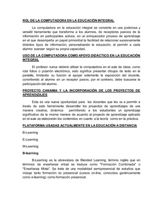 Este documento describe el rol de la computadora en la educación integral y su uso como apoyo didáctico. También habla sobre el proyecto Canaima y la incorporación de proyectos de aprendizaje de manera creativa y dinámica a través de esta herramienta tecnológica. Finalmente, explica diferentes plataformas usadas actualmente en la educación a distancia como B-Learning, E-Learning, M-Learning y plataformas como Moodle, UNESK y Dokeos usadas por la UNESR.