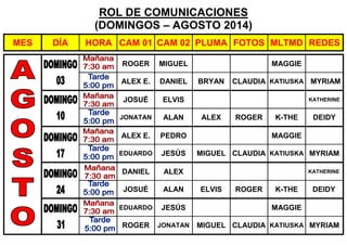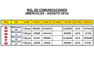 Este documento presenta los roles de comunicaciones para dos domingos y cuatro miércoles de agosto de 2014. Enlista los nombres de las personas asignadas a cámaras, fotografía, redes sociales y otros roles para esas fechas.
