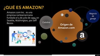 Amazon comenzó en 1994 como una librería online fundada por Jeff Bezos y se ha diversificado a la venta de una amplia variedad de productos. Ha tenido mucho éxito gracias a su enfoque en la excelencia del servicio al cliente a través de la entrega rápida, devoluciones fáciles y su programa Prime. Amazon continúa innovando con nuevas tecnologías como machine learning, realidad aumentada y tiendas físicas para ofrecer nuevas formas de comprar.