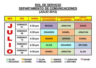 Este documento presenta los roles de servicio del departamento de comunicaciones para julio de 2012. Incluye los horarios de los camarógrafos los domingos y miércoles del mes, asignando a cada uno a una de las 4 cámaras disponibles y el responsable de cada día.