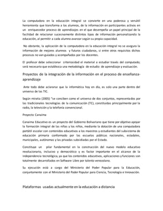 El documento describe el rol de la computadora en la educación como una herramienta versátil que permite personalizar el aprendizaje. También discute varios proyectos educativos en Venezuela como Canaima Educativo y diferentes plataformas usadas en la educación a distancia como Moodle y Dokeos, las cuales son usadas por la Universidad Nacional Experimental Simón Rodríguez.