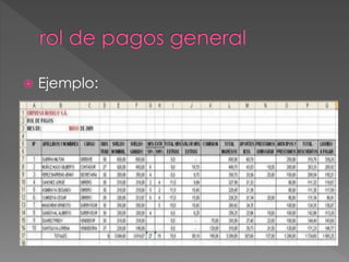 El documento describe las columnas y fórmulas utilizadas en una hoja de cálculo de nómina para registrar la información de los empleados de una empresa. Se detallan las columnas para el sueldo, horas extras, comisiones, descuentos, e ingresos totales de cada empleado en el rol general de nómina. Luego explica cómo generar un rol de pago individual para cada empleado utilizando fórmulas que extraen los datos correspondientes del rol general.