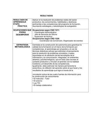 Este documento describe las competencias, resultados y estrategias metodológicas para el rol de aprendiz en administración. Presenta 11 competencias clave como producir documentos siguiendo la normativa y facilitar el servicio al cliente. Los resultados incluyen aplicar conocimientos en la resolución de problemas reales y ocupaciones como coordinador administrativo. La estrategia se centra en construir autonomía a través de proyectos, técnicas activas y tecnología para vincular al aprendiz con la realidad cotidiana.