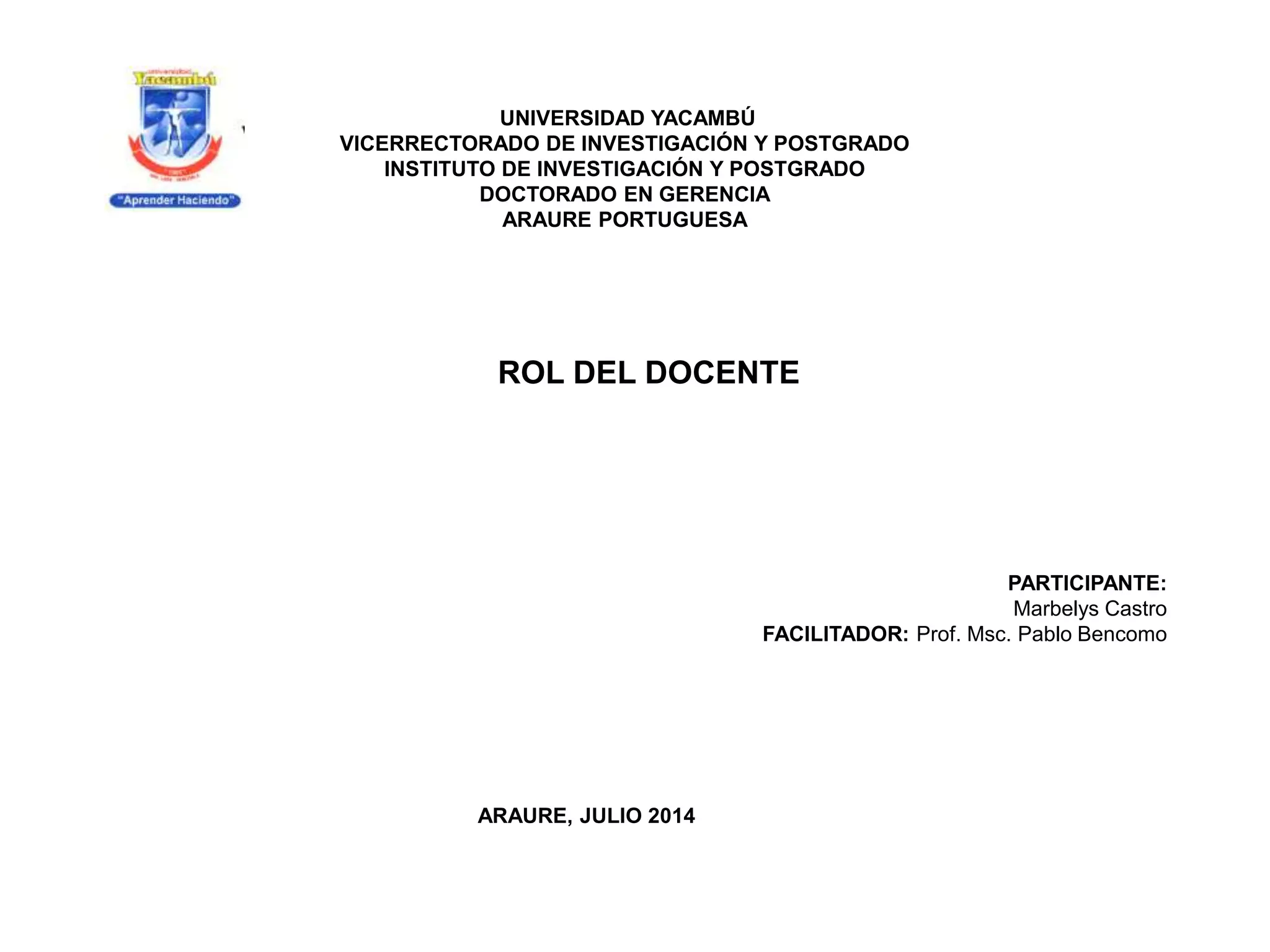 El documento describe el rol del docente en la Universidad Yacambú, destacando la necesidad de ser orientador, usuario competente de recursos, creador de materiales, investigador y evaluador. También se enfatiza la importancia de motivar a los estudiantes como estrategia clave para el aprendizaje. Estas funciones son esenciales para generar aprendizajes constructivistas y significativos.