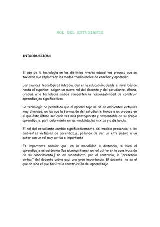 El documento describe el rol del estudiante en entornos virtuales de aprendizaje. Explica que el estudiante pasa de ser pasivo a ser un actor activo responsable de su propio aprendizaje. Detalla las características que debe tener un estudiante como la motivación, autogestión y responsabilidad. También describe el rol del profesor como un facilitador del aprendizaje y las ventajas de la educación virtual como la flexibilidad y el acceso ampliado.