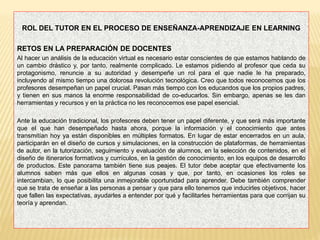 Este documento describe los roles y responsabilidades del tutor en la enseñanza virtual. Explica que el tutor debe desempeñar roles como facilitador, administrador, organizador y socializador. También requiere habilidades como la empatía, la capacidad de desarrollar a otros y facilitar debates. Concluye que el tutor es vital para el éxito del aprendizaje virtual y que se necesita avanzar hacia la profesionalización de los tutores.