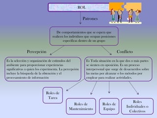 Este documento trata sobre los conceptos de rol y status. Explica que un rol son los comportamientos esperados de una persona en una posición específica dentro de un grupo, y que existen roles de tarea, mantenimiento y equipo. También define al status como la situación de una persona con respecto a los demás dentro de un sistema social, y que determina derechos, obligaciones y expectativas. Finalmente, indica que una persona ocupa un status y desempeña un rol.